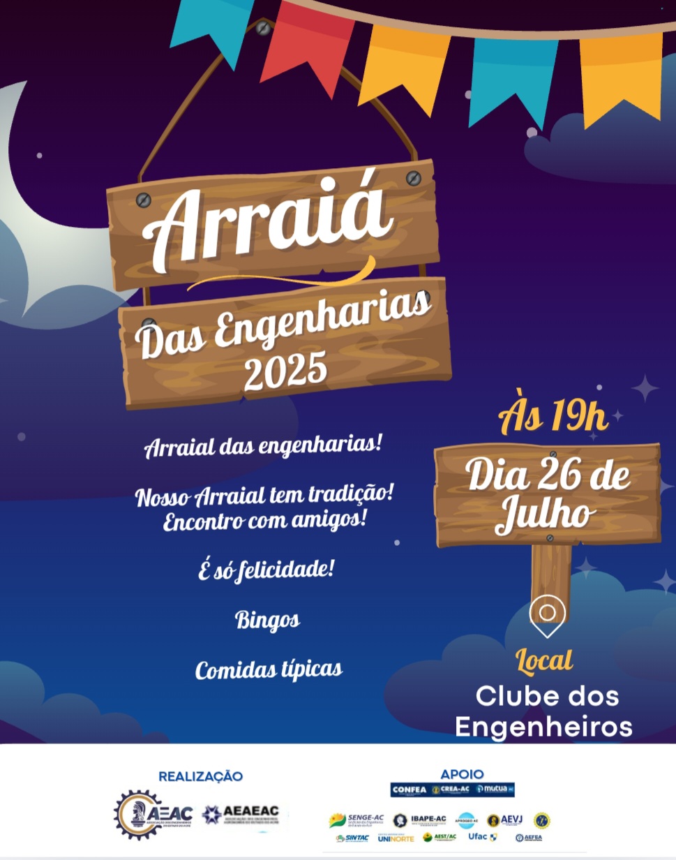 A Associação dos Engenheiros do Acre e a Associação dos Engenheiros Agrônomos, está promovendo o “Arraiá das Engenharias”, neste sábado, 26 de julho às 19h.