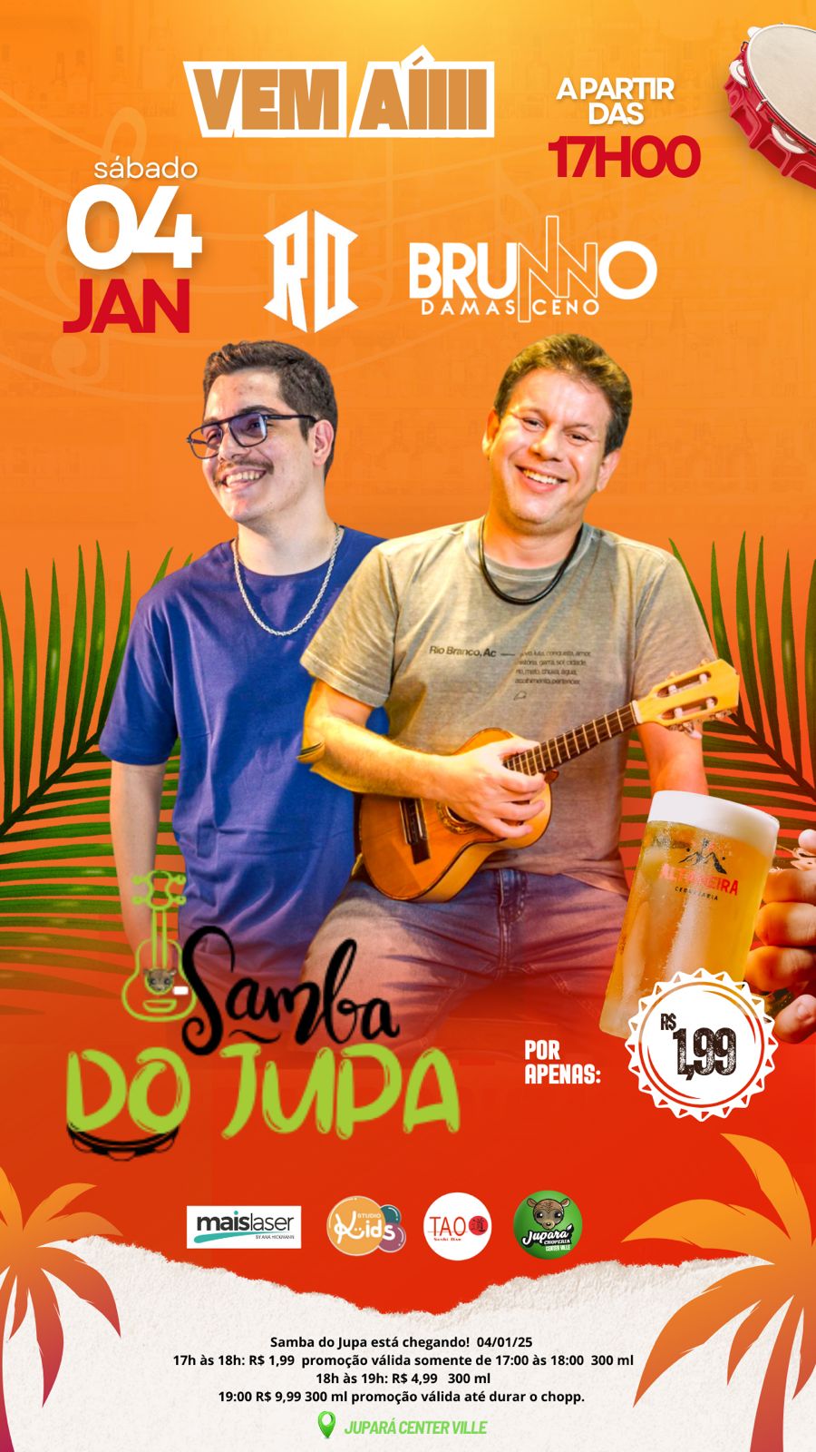 Rio Branco se prepara para receber, no dia 4 de janeiro de 2025, o primeiro Samba do Jupa, evento que promete reunir música de qualidade, diversão e ofertas especiais para o público. Com entrada gratuita, a programação terá início às 17h, no Jupará Center Ville, e contará com as apresentações de RD e Brunno Damasceno, garantindo uma tarde repleta de samba e animação.