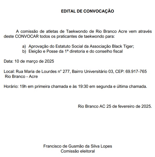 Comissão de atletas do Taekwondo de Rio Branco lança edital de convocação para praticantes afim de aprovar estatuto e eleger diretoria