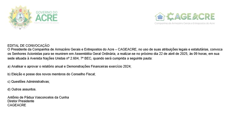 EDITAIS Diretor presidente da Cageacre publica edital de convocação para assembleia geral ordinária dia 22 Publicado 6 meses atrás em 8 de abril de 2025 Por Redação AcreNews Tópicos relacionados: A seguir Rolv comercial Ltda torna público que requereu do imac a Licença de Operação para atividade de comércio Varejista de Combustíveis Não perca Hotéis F. Telles Netto e Filhos Ltda Torna público que requereu do IMAC a renovação de licença para a atividade de operacionalização de um hotel Continue lendo Você pode gostar