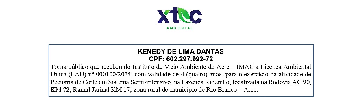 EDITAIS Edital de Concessão de Licença Ambiental Única ao Sr. Kenedy de Lima Dantas – LAU nº 000100/2025 Publicado 3 horas atrás em 29 de outubro de 2025 Por Redação Acrenews Tópicos relacionados: Não perca Posto Progresso torna público que recebeu do IMAC Licença de Operação para Posto Flutuante de combustíveis em Feijó Continue lendo Você pode gostar