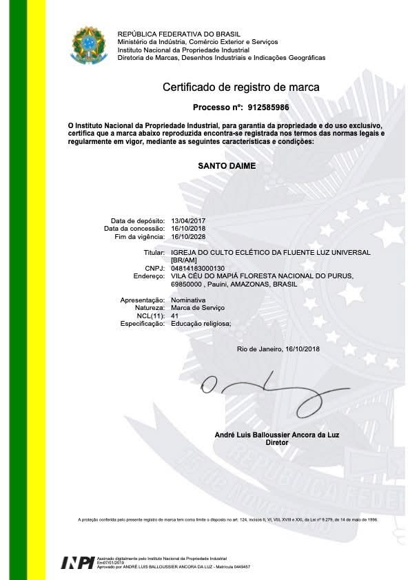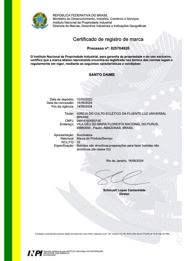 O Instituto Nacional da Propriedade Industrial (Inpi) renovou em meados de 2024, por mais 10 anos, quatro de cinco certificados de concessão às Igreja do Culto Eclético da Fluente Luz Universal e Igreja do Culto Eclético da Fluente Luz Universal, do mesmo grupo, em Pauini (AM), “para garantia da propriedade e do uso exclusivo” da marca “Santo Daime”, especificadas nos documentos como produtos e serviços, bebidas não alcoólicas e preparações para fazer bebidas não alcoólicas, além de educação religiosa.