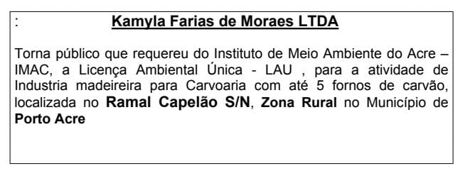 EDITAIS Kamyla Farias de Moraes Ltda informa que requereu do Imac licença para atividade se carvoaria em Porto Acre Publicado 9 meses atrás em 8 de janeiro de 2025 Por Redação AcreNews Tópicos relacionados: A seguir Comissão de atletas de Taekwondo convoca praticantes para aprovação de estatuto dos Black Tiger Não perca ICMBio: inscrições para concurso terminam nesta sexta; são 350 vagas e salários de até R$ 8,8 mil Continue lendo Você pode gostar