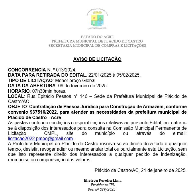 EDITAIS Prefeitura de Plácido de Castro divulga edital de licitação para a contrução de armazém Publicado 9 meses atrás em 21 de janeiro de 2025 Por Redação AcreNews Tópicos relacionados: A seguir Prefeitura de Plácido de Castro divulga edital de licitação para a contrução de escola Não perca Comissão de atletas de Taekwondo convoca praticantes para aprovação de estatuto dos Black Tiger Continue lendo Você pode gostar