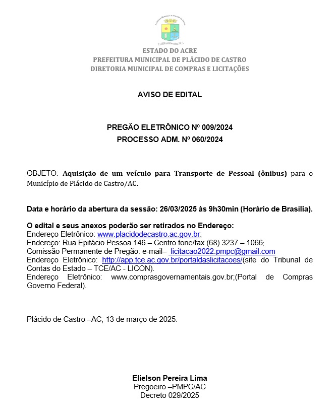 EDITAIS Prefeitura de Plácido de Castro publica aviso de edital para pregão eletrônico com objetivo de adquirir um ônibus Publicado 8 meses atrás em 13 de março de 2025 Por Redação AcreNews Tópicos relacionados: A seguir Prefeitura de Plácido de Castro publica aviso de edital para pregão eletrônico com objetivo de adquirir um ônibus Não perca Posto Village Ltda torna público que requereu do IMAC a renovação da licença para Transporte Rodoviário de produtos perigosos no estado do Acre Continue lendo Você pode gostar