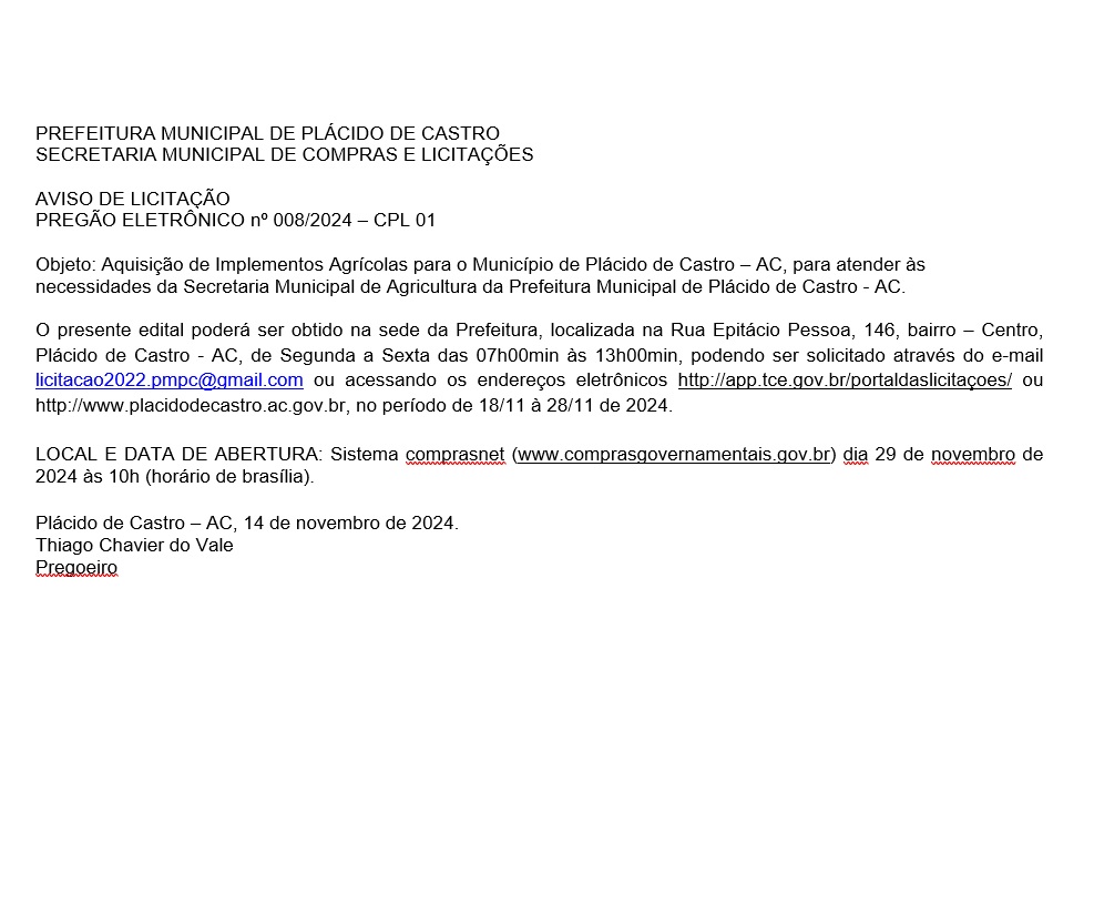 EDITAIS Prefeitura de Plácido de Castro publica edital para aquisição de implementos agrícolas Publicado 12 meses atrás em 18 de novembro de 2024 Por Redação AcreNews Tópicos relacionados: A seguir Prefeitura de Plácido de Castro divulga prorrogação de licitação para aquisição de implementos agrícolas Não perca Auto Posto Ribeirão torna publico que recebeu do Imac a licença de operação para transporte de combustíveis no Acre Continue lendo Você pode gostar
