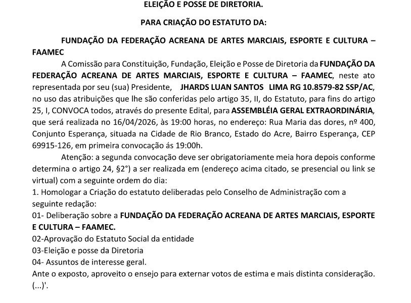 EDITAL DE CONVOCAÇÃO ASSEMBLÉIA GERAL ORDINÁRIA DE CONSTITUIÇÃO, FUNDAÇÃO, ELEIÇÃO E POSSE DE DIRETORIA. PARA CRIAÇÃO DO ESTATUTO DA: FUNDAÇÃO DA FEDERAÇÃO ACREANA DE ARTES MARCIAIS,...