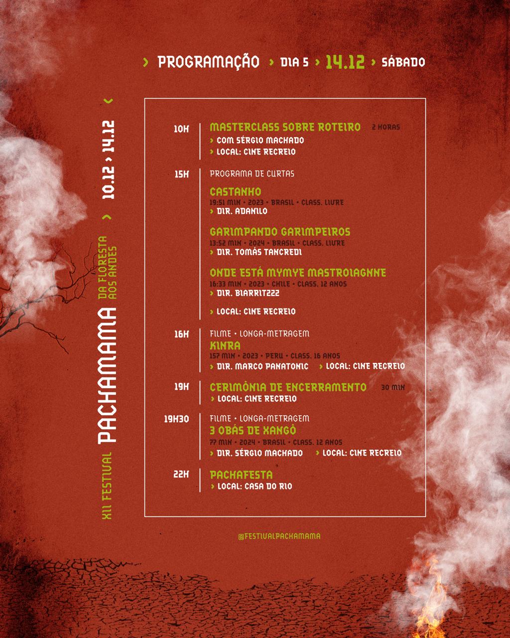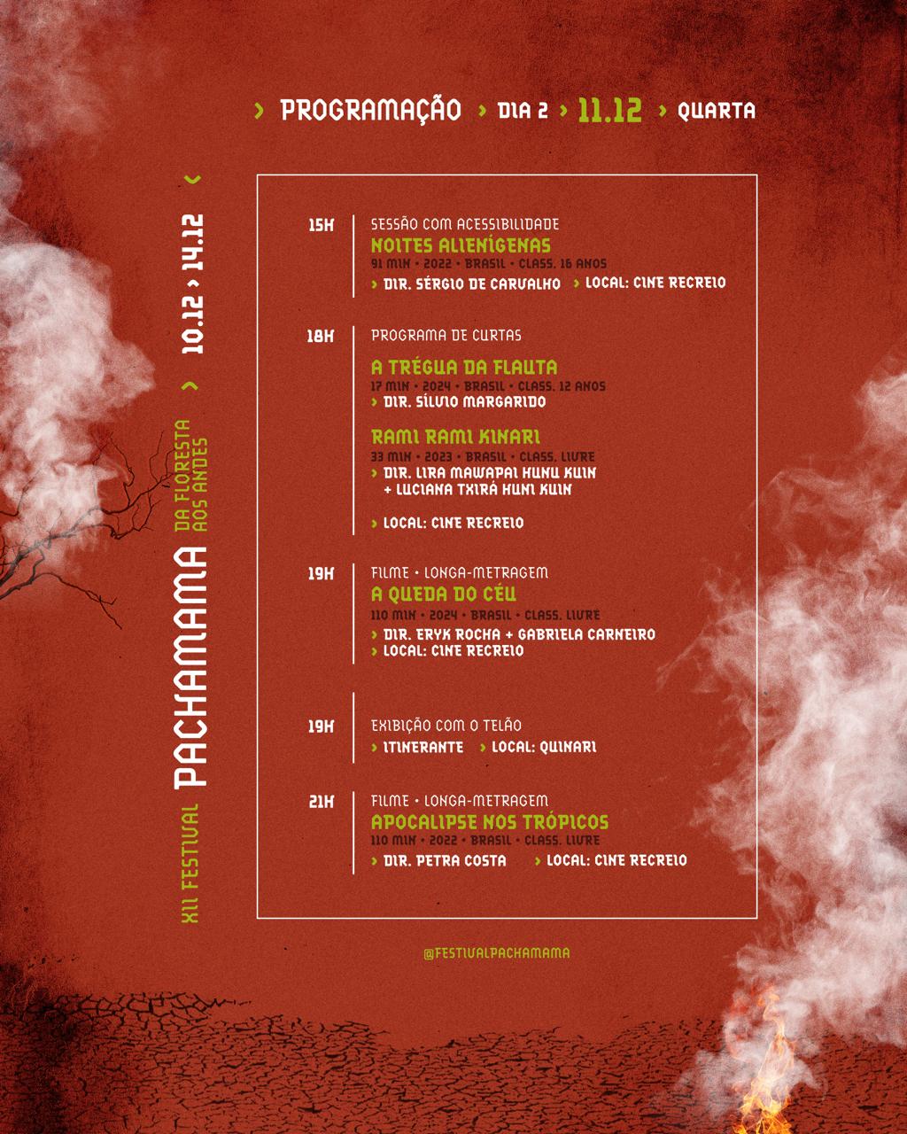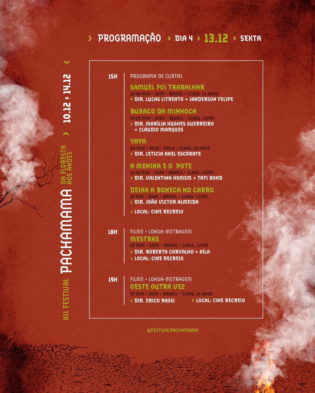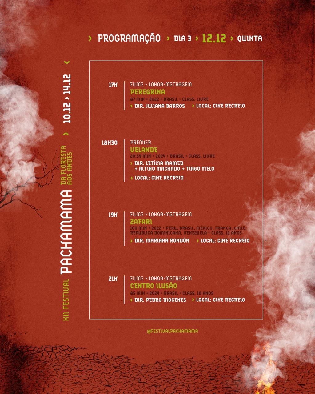 A terceira etapa do Festival Pachamama: da Floresta aos Andes, que ocorre de 10 a 14 de dezembro, traz uma rica programação cultural em Rio Branco e Senador Guiomard. Com exibição de filmes, debates e atividades formativas, o evento promete movimentar espaços como: Cine Teatro Recreio, Filmoteca, Museu dos Povos Acreanos e a Casa Rio. Nesta edição o evento contará com acessibilidade em Libras nas sessões.
