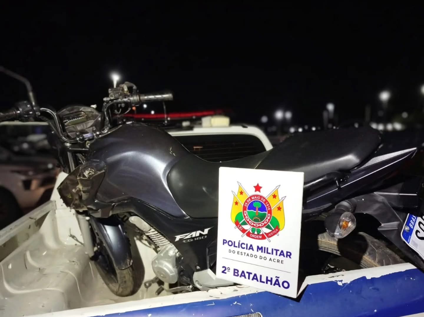 Uma motocicleta roubada foi localizada pela Polícia Militar na tarde deste sábado, (03), no bairro Triângulo, Segundo Distrito de Rio Branco.