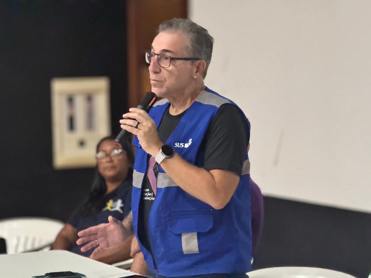 Durante sua fala, o palestrante destacou a importância da qualificação contínua dos profissionais que atuam diretamente no cuidado à população.