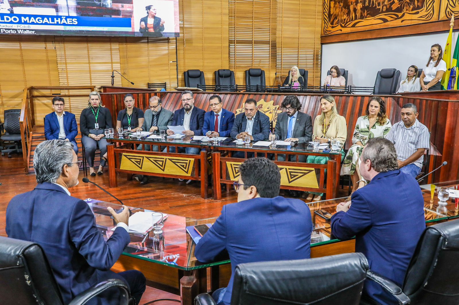 A reunião contou com a presença do presidente Gonzaga, senador Alan Rick, deputado federal Zezinho Barbary, prefeito de Porto Walter, César Andrade, representantes do Deracre, Ibama, Imac e demais parlamentares.