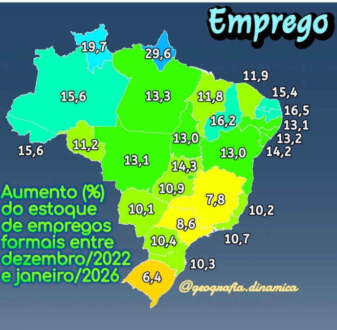 O desempenho acreano também supera com ampla margem o do Rio Grande do Sul, que teve alta de apenas 6,2% no mesmo intervalo, evidenciando diferenças regionais no ritmo de geração de empregos.