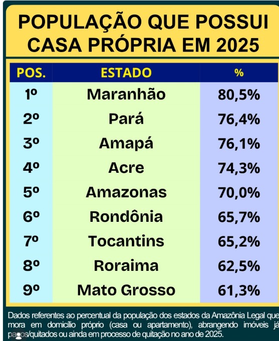 O Acre aparece em destaque no cenário habitacional da Amazônia Legal ao registrar 74,3% da população vivendo em imóvel próprio em 2025, ocupando a 4ª posição no ranking regional. O dado coloca o estado à frente de unidades como Amazonas (70,0%) e Rondônia (65,7%), e próximo de líderes como Pará (76,4%) e Amapá (76,1%).O levantamento, com base em dados do IBGE (2025), mostra que o Acre mantém um índice elevado de moradia própria, refletindo um padrão histórico da região Norte, onde a aquisição da casa própria ainda predomina sobre o aluguel.