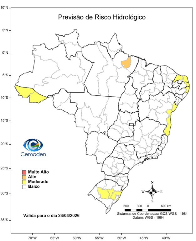 No campo geológico, o alerta do Cemaden aponta risco moderado de deslizamentos apenas na Bahia, sem registro desse tipo de ameaça para o Acre neste momento.