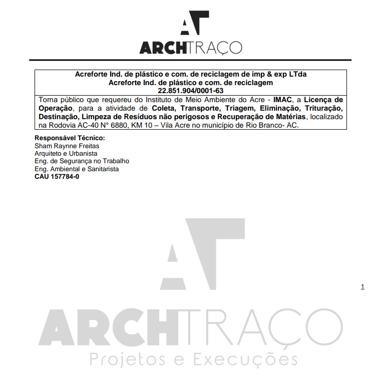 EDITAIS Acreforte torna público que requereu do IMAC a licença de operação para coleta, transporte e triagem de resíduos não perigosos em Rio Branco Publicado 11 meses atrás em 25 de novembro de 2024 Por Redação AcreNews Tópicos relacionados: A seguir Prefeitura de Plácido de Castro publica aviso de leilão para alienação de bens móveis inservíveis Não perca Paulo Henrique dos Santos torna publico que requereu do IMAC licença de operação para comércio varejista de petróleo em Tarauacá Continue lendo Você pode gostar