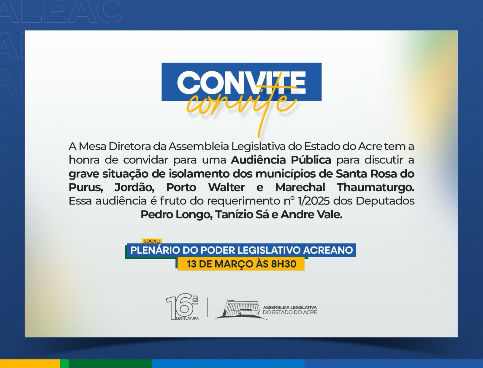 A agenda da Aleac para os próximos dias inclui uma Audiência Pública para discutir a grave situação de isolamento dos municípios de Santa Rosa do Purus, Jordão, Porto Walter e Marechal Thaumaturgo. O debate será realizado no Plenário do Poder Legislativo Acreano, no dia 13 de março, às 8h30. A iniciativa é fruto do requerimento dos deputados Pedro Longo, Tanízio Sá e André Vale.