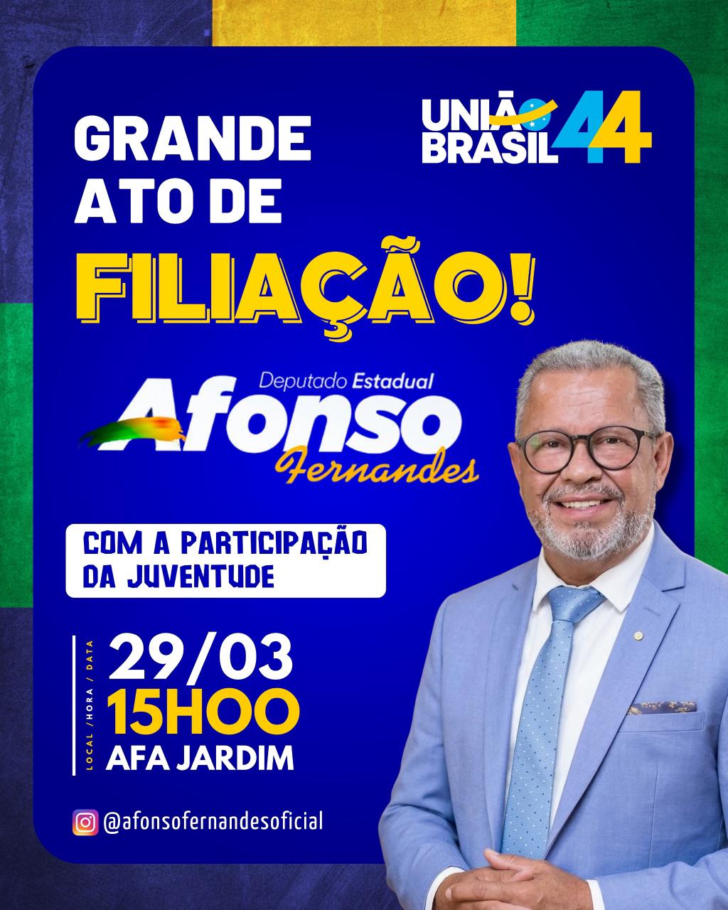 O deputado estadual Afonso Fernandes realiza no próximo dia 29 de março, às 15 horas, na AFA Jardim, em Rio Branco, um grande ato político que marcará sua filiação ao União Brasil e deve reunir lideranças de todo o estado, apoiadores, representantes da juventude e autoridades que integram o grupo político que vem se fortalecendo no Acre.
