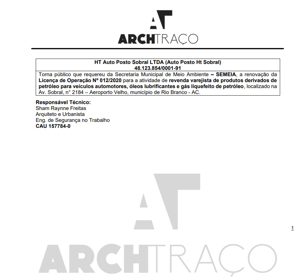 Auto Posto HT Sobral torna público que requereu da SEMEIA renovação de licença operação para revenda de combustíveis em Rio Branco