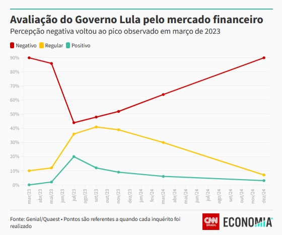 A avaliação negativa do mercado financeiro sobre o terceiro mandato de Luiz Inácio Lula da Silva (PT) voltou em dezembro ao pico de 90%, segundo dados da pesquisa Genial/Quaest, publicados nesta quarta-feira (4).