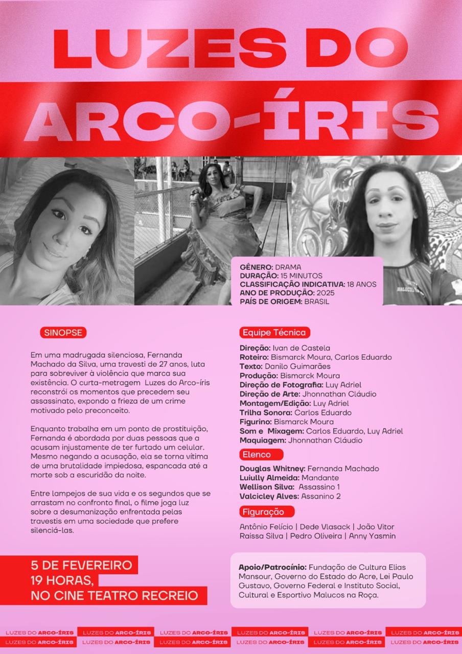 O curta-metragem “Luzes do Arco-Íris”, escrito por Bismark Moura e Carlos Eduardo, e dirigido por Ivan de Castela, estreia nesta quarta-feira, 5, às 19h, no Cine Teatro Recreio, em Rio Branco (AC). Com entrada gratuita e classificação indicativa para maiores de 18 anos, o filme promete emocionar e provocar reflexões profundas sobre a violência contra pessoas trans no Brasil.
