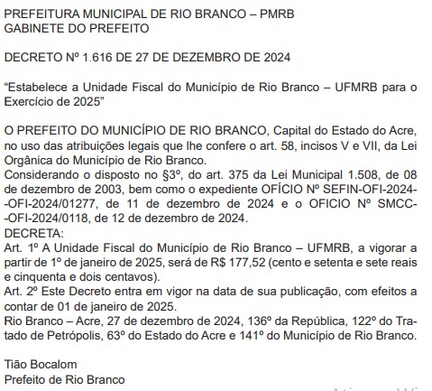 A Prefeitura de Rio Branco, por meio do Decreto nº 1616 de 27 de dezembro de 2024, publicado no Diário Oficial do Estado do Acre (DOE-AC) desta segunda-feira (30), definiu o valor da Unidade Fiscal do Município de Rio Branco (UFMRB) para o exercício de 2025.