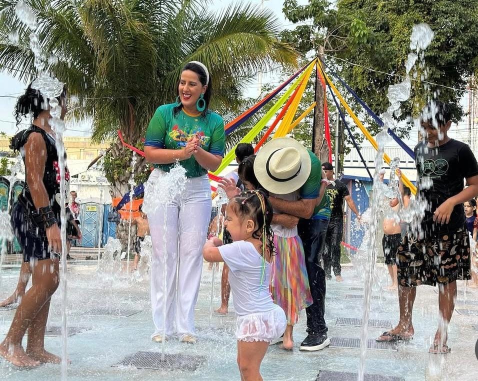 A cena chamou a atenção de quem estava no local, arrancando sorrisos dos presentes. Enquanto a criançada já fazia da fonte um ponto de diversão espontânea, Bocalom e a primeira-dama decidiram se juntar a elas.