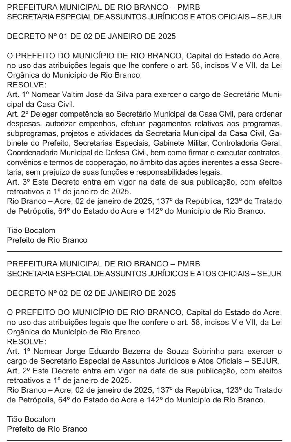 O prefeito de Rio Branco Tião Bocalom (PL) oficializou nesta sexta-feira, 3, as nomeações de Valtim José da Silva como Secretário Municipal da Casa Civil e de Jorge Eduardo Bezerra de Souza Sobrinho como Secretário Especial de Assuntos Jurídicos e Atos Oficiais (SEJUR).