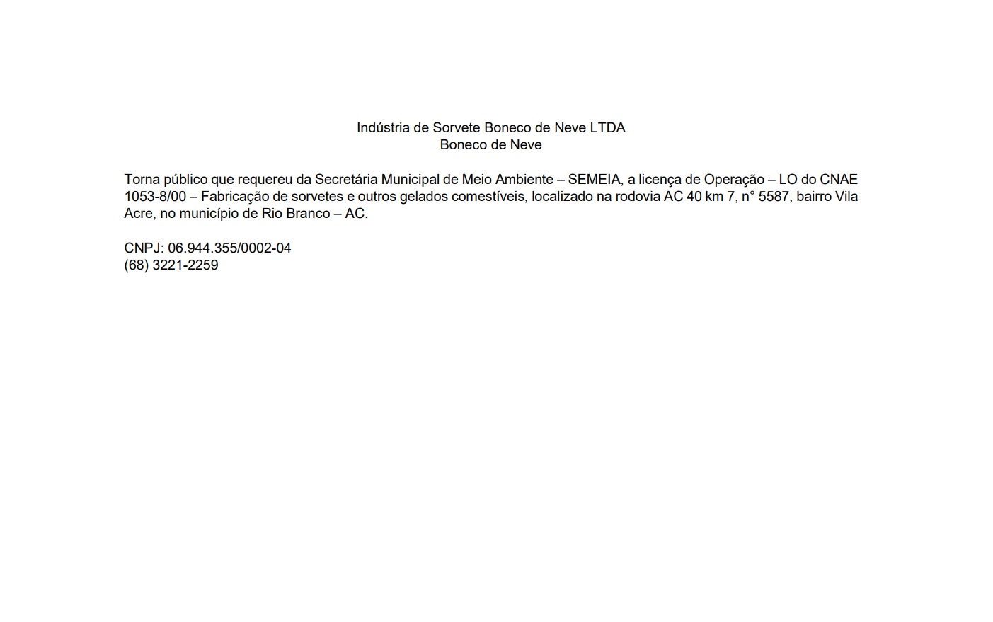 EDITAIS BONECO DE NEVE SEGUINDO INSTRUÇÕES DO SEMEIA SOLICITA LICENÇA PARA FABRICAÇAO DE SORVETES E OUTROS GELADOS Publicado 1 ano atrás em 18 de setembro de 2024 Por Redação AcreNews Tópicos relacionados: A seguir Prefeitura de Plácido de Castro divulga edital de licitação para aquisição de veículo Não perca J H de Figueiredo Souza Ltda informa ter requerido do Imac licença para comércio varejista de combustíveis em Tarauacá Continue lendo Você pode gostar