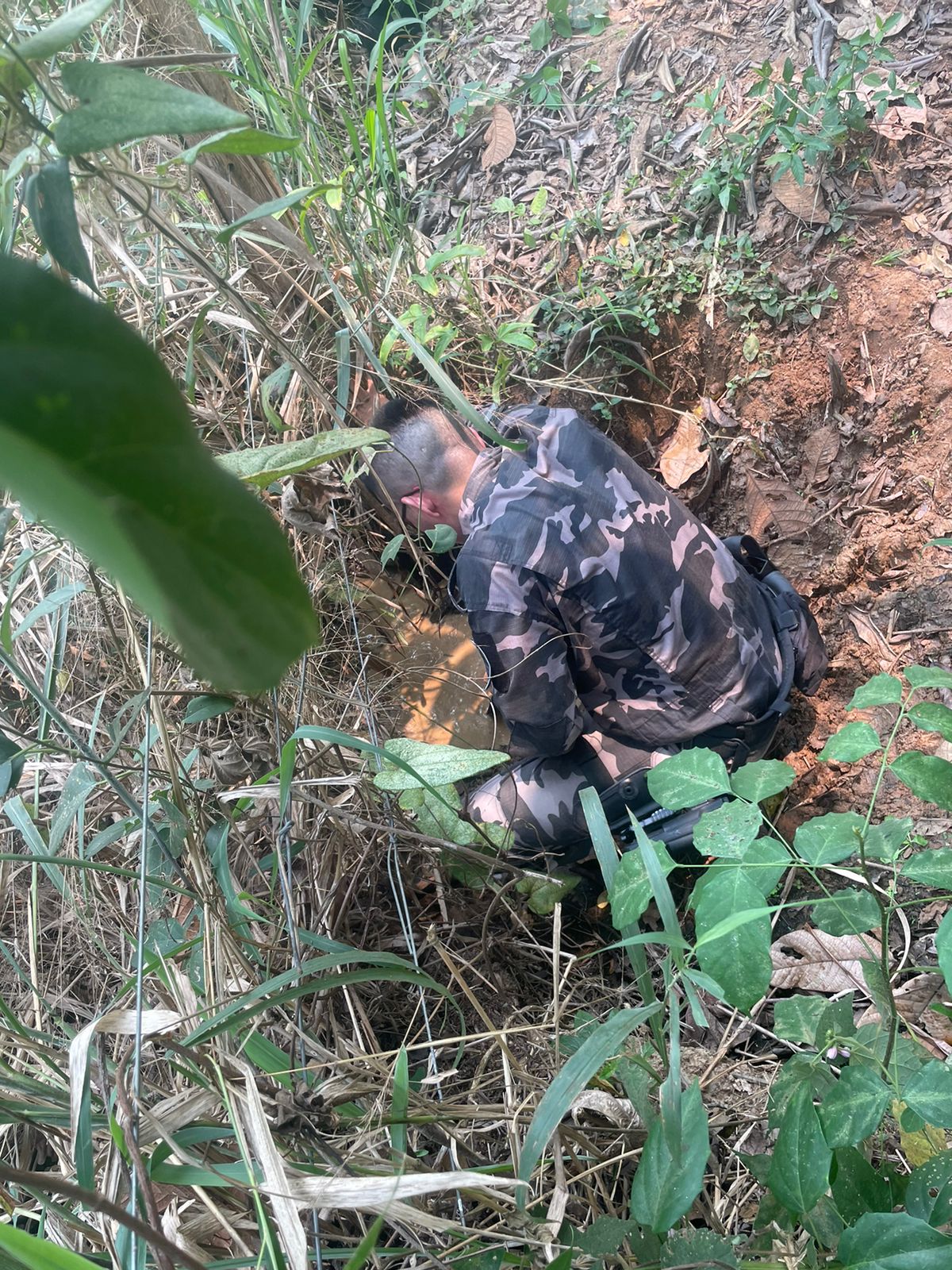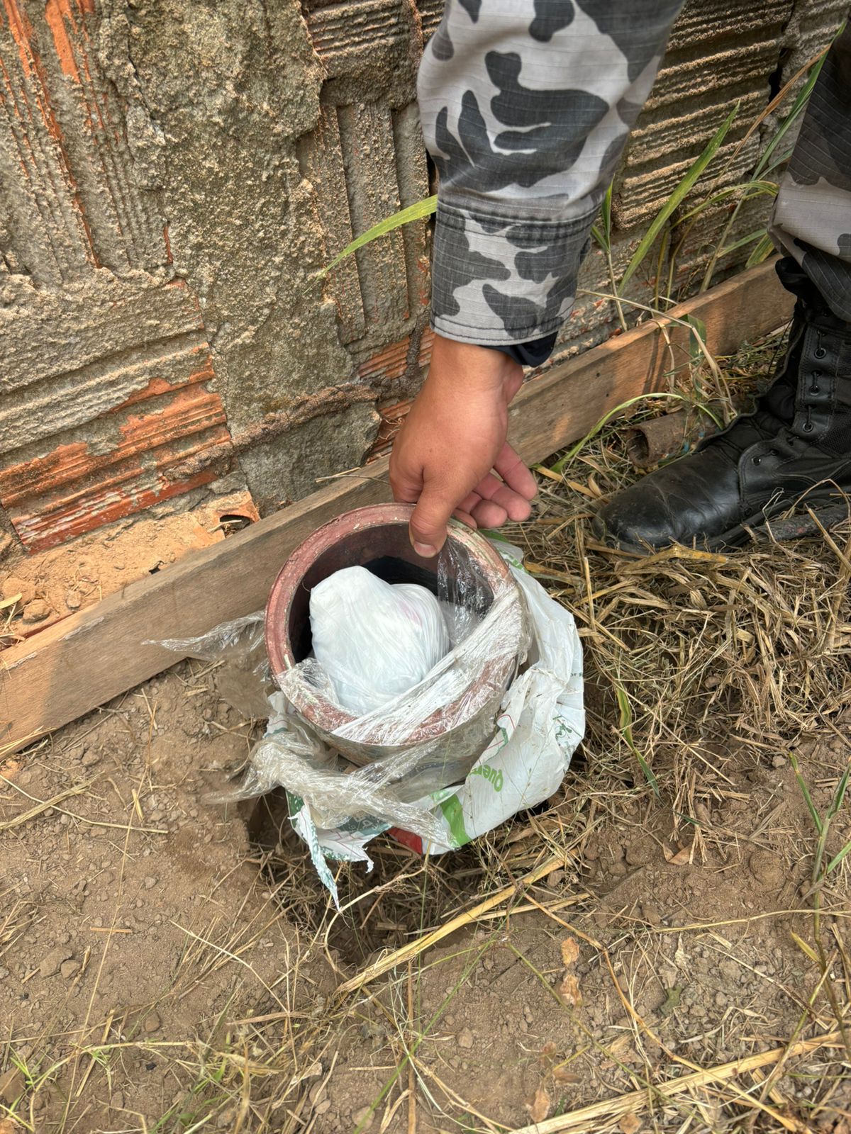 Os policiais receberam informações que em um terreno baldio, próximo a residência do envolvido existiam mais entorpecentes. Com apoio do cão especialista em faro de narcóticos, K9 Piscapega, os militares iniciaram buscas no terreno encontrando enterrado 10 embalagens de substância aparentando ser oxidado de cocaína totalizando 10, 380 quilogramas.