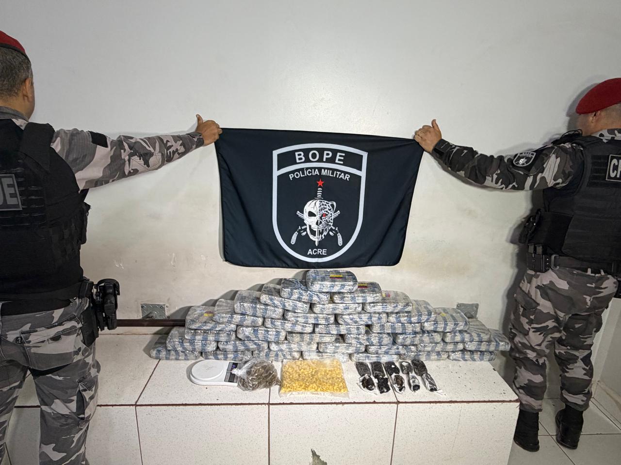 Durante a busca no interior do imóvel, os militares localizaram diversos fardos de skunk, também conhecida como “supermaconha”, totalizando mais de 40 quilos da droga. O carregamento está avaliado em um alto valor para o crime organizado.