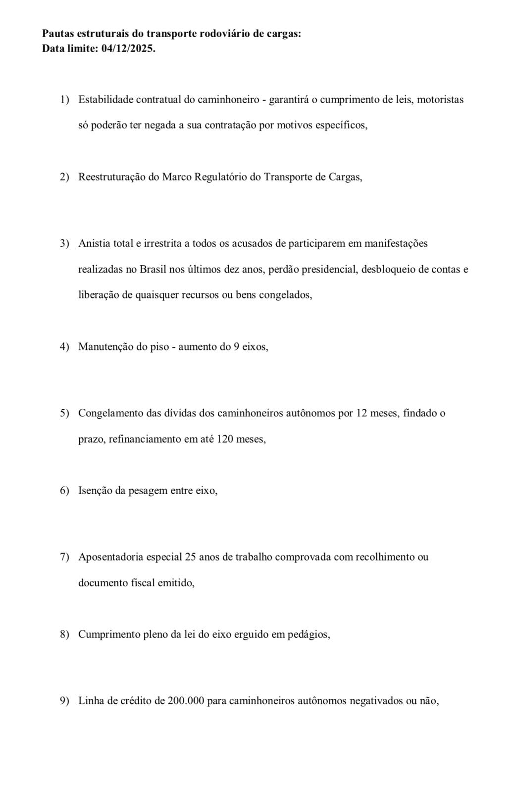 O documento amplamente disseminado nas redes reúne 18 demandas atribuídas aos trabalhadores e inclui temas de forte teor político, entre eles anistia total e irrestrita aos condenados pelos ataques do 8 de Janeiro.