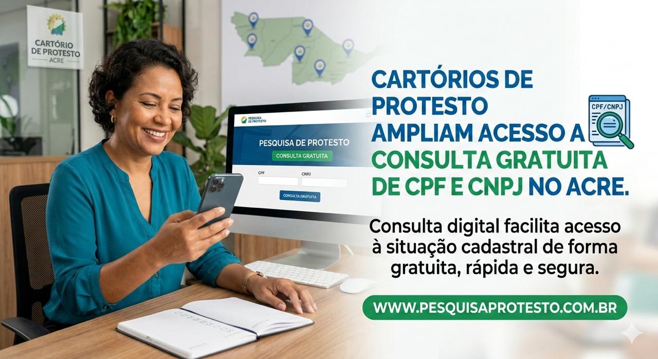 O Instituto de Estudos de Protesto de Títulos do Brasil – Seção Acre (IEPTB-AC) está divulgando a plataforma on-line que permite a qualquer cidadão pesquisar, de forma rápida, se há protestos vinculados ao seu CPF ou CNPJ. A ferramenta reúne dados de cartórios de protesto de todo o país.