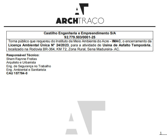 EDITAIS Castilho Engenharia e Empreendimentos S/A torna público que requereu do IMAC o encerramento de licença para usina de asfalto Publicado 4 meses atrás em 12 de junho de 2025 Por Redação AcreNews Tópicos relacionados: A seguir Pre Molde Indústria de Concreto torna público que requereu do IMAC licença para fabricação de artefatos de cimento Não perca Posto Triângulo Ltda informa que requereu do IMAC licença para transporte rodoviário de combustíveis Continue lendo Você pode gostar