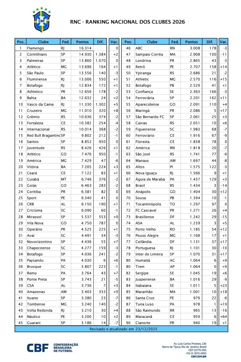 Com apenas um clube acreano presente (SC Humaitá) presente na lista das 100 melhores do país, a Confederação Brasileira de Futebol (CBF) divulgou nesta quarta-feira (24), o Ranking Nacional de Clubes (RNC) de 2026.
