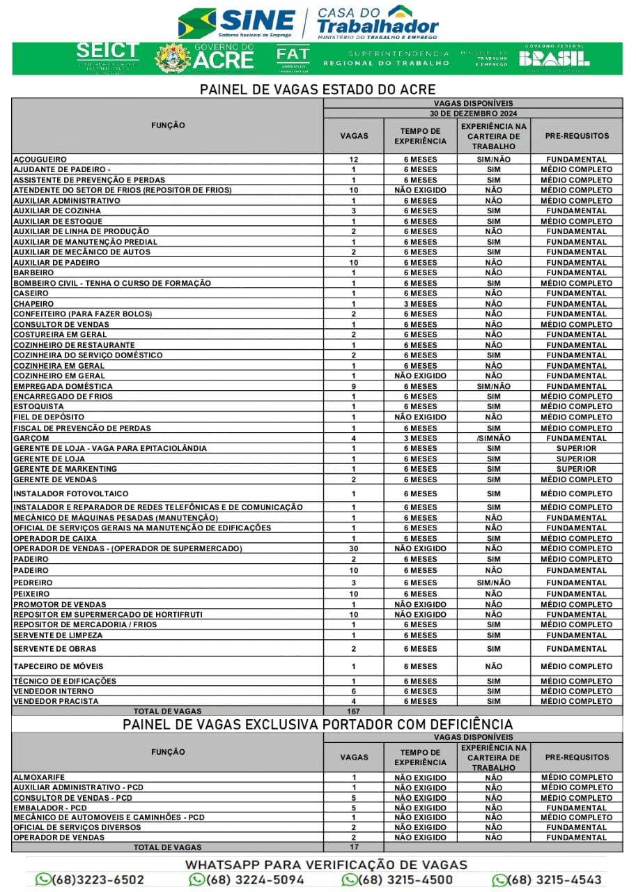 O Sistema Nacional de Emprego do Acre (Sine) divulgou segunda-feira (30) quase 200 vagas de emprego disponíveis para diversas áreas na capital Rio Branco. As oportunidades abrangem diferentes setores, oferecendo uma variedade de opções para os candidatos em busca de colocação no mercado de trabalho.