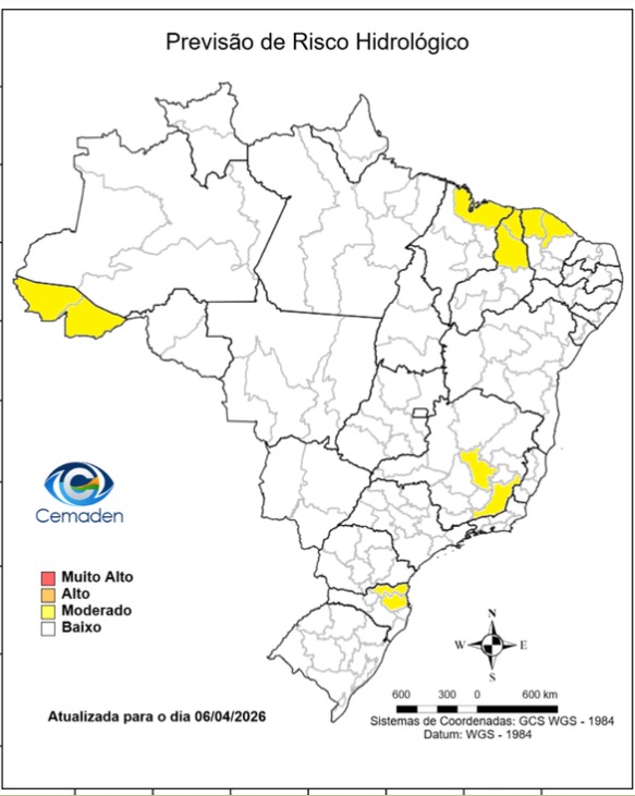 O Brasil registra, nesta segunda-feira (6) risco hidrológico moderado em pelo menos sete Estados, segundo monitoramento do Centro Nacional de Monitoramento e Alertas de Desastres Naturais. No Acre, o cenário exige atenção reforçada devido à cheia dos principais rios do estado.