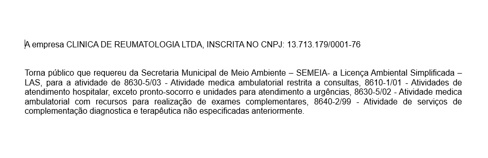 Clínica de Reumatologia Ltda torna público que requereu da Semeia licença para atividade médica ambulatorial