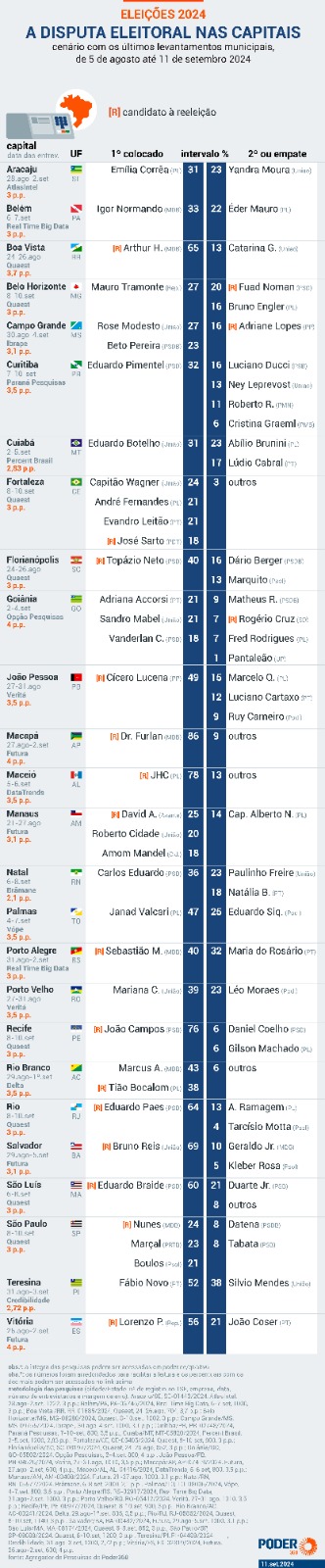 O Partido Liberal (PL), sigla do ex-presidente Jair Bolsonaro, tem se destacado como o partido com mais candidatos competitivos nas maiores cidades do Brasil. De acordo com as pesquisas mais recentes, o PL possui 17 filiados que estão liderando ou empatados na liderança dentro da margem de erro em 85 dos 103 municípios com mais de 200 mil eleitores, conhecidos como G103.