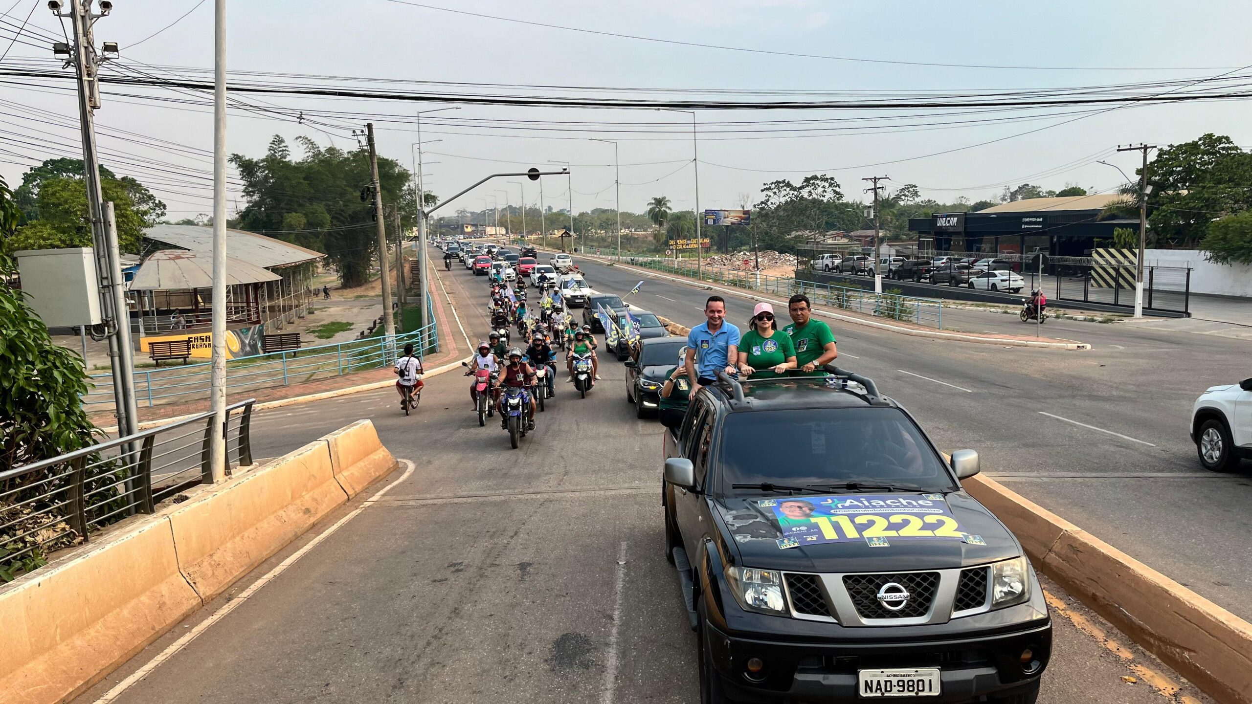 Com uma tarde ensolarada, o candidato a vereador pelo município de Rio Branco, Aiache cumpriu sua agenda de campanha com a carreata do 11.222, na tarde desta quinta-feira, 3. A concentração aconteceu em frente a Arena da Floresta, e seguiu com percurso na Avenida Ceará.