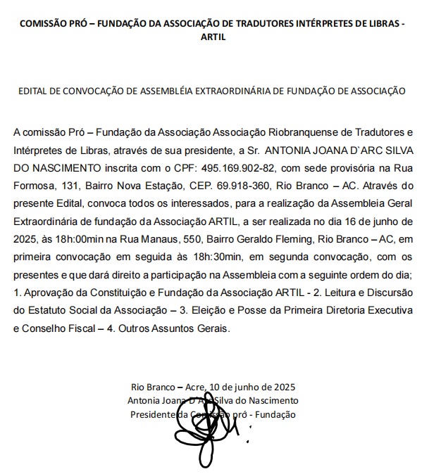 Comissão pró-fundação da Associação de Interpretes de Libras convoca interessados para assembleia geral dia 16