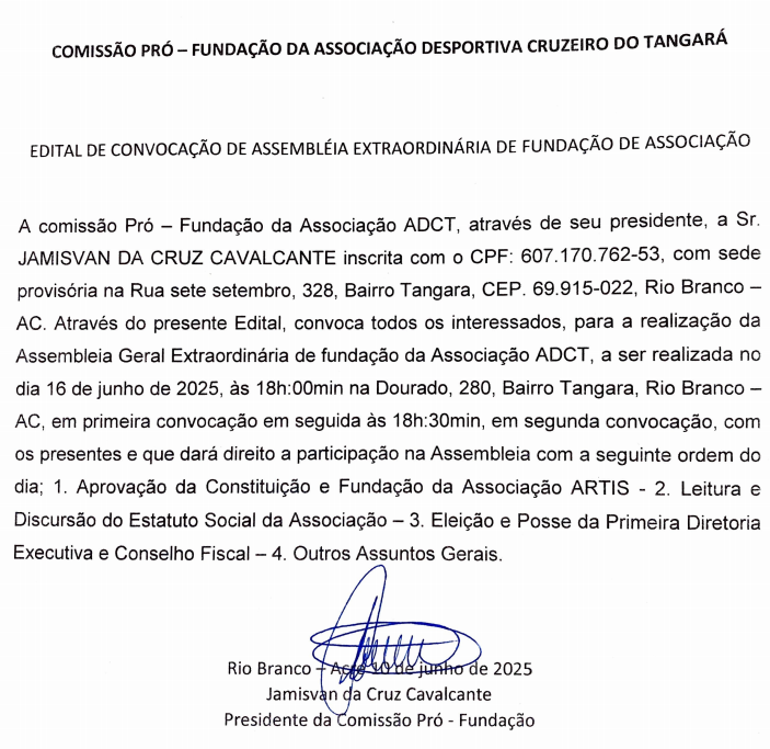 EDITAIS Comissão pró-fundação da Associação Desportiva Cruzeiro do Tangará convoca interessados para assembleia geral dia 16 Publicado 4 meses atrás em 12 de junho de 2025 Por Redação AcreNews Tópicos relacionados: A seguir Comissão pró-fundação da Associação de Interpretes de Libras convoca interessados para assembleia geral dia 16 Não perca Pre Molde Indústria de Concreto torna público que requereu do IMAC licença para fabricação de artefatos de cimento Continue lendo Você pode gostar