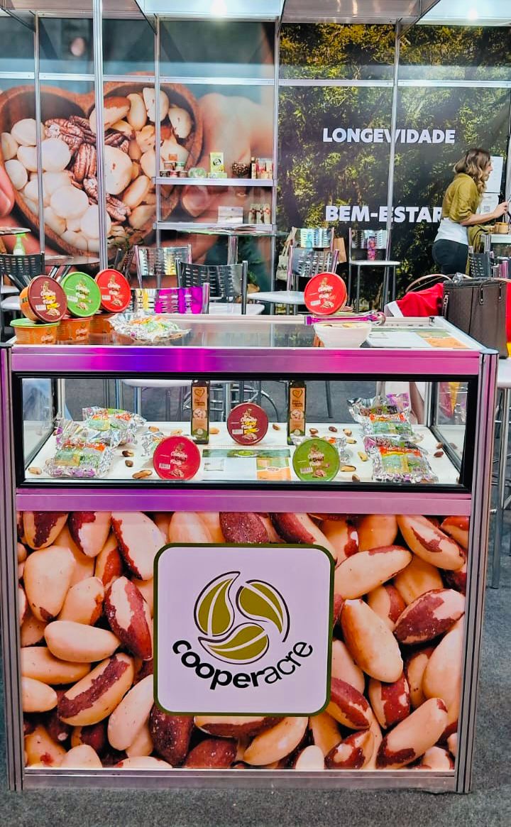 A Cooperacre está sendo representada na NaturalTech pelo Gerente de Vendas Kássio Almada e pela Conselheira Fiscal da cooperativa, Fátima Nascimento, com a exposição de produtos da bioeconomia como a castanha-da-Amazônia, palmito de pupunha, óleo de castanha e as castanhas saborizadas no estande da Associação Brasileira de Nozes e Castanhas (ACNC) e no estande da OCB Nacional.