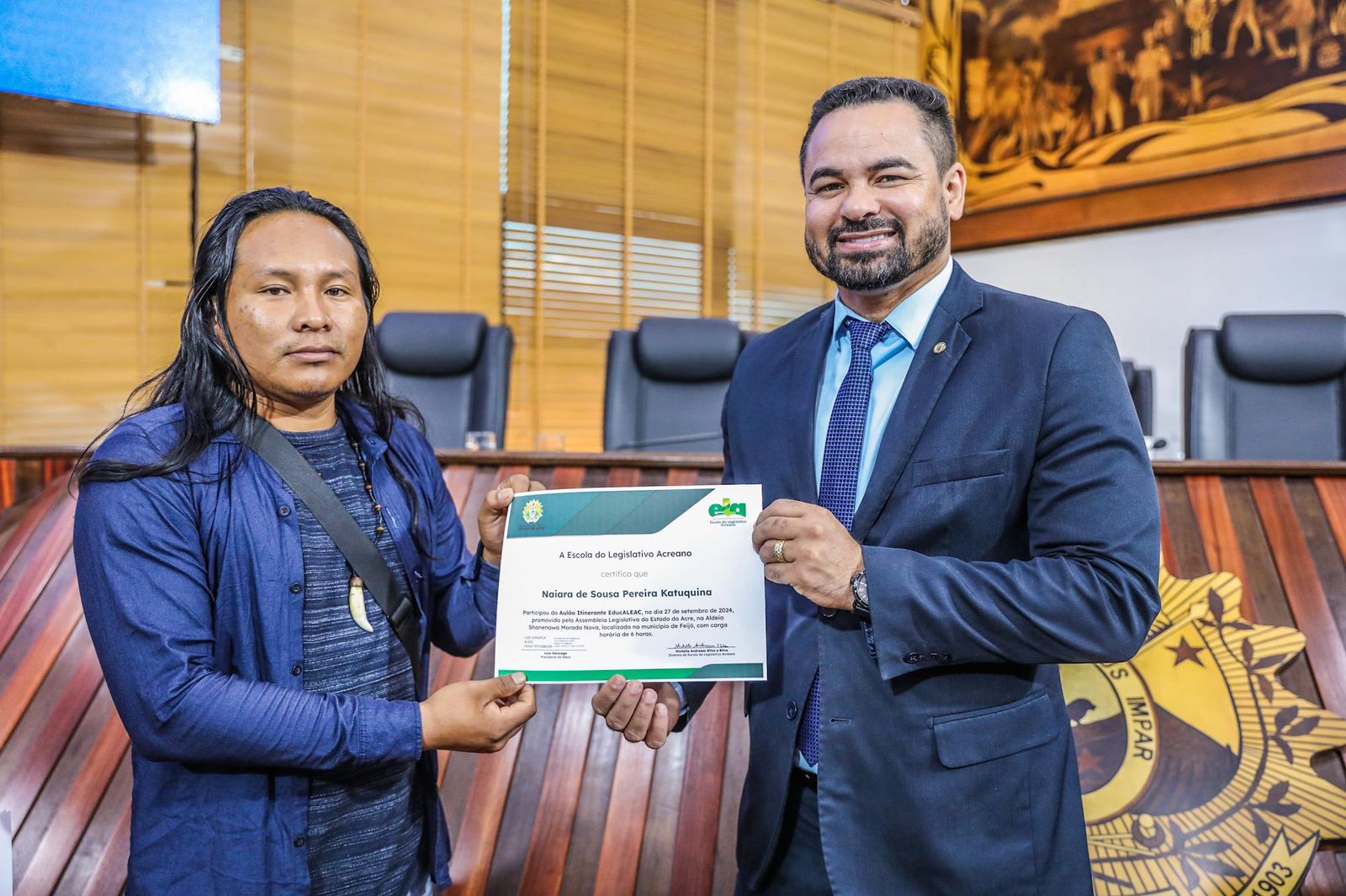 Os certificados dos estudantes que participaram do primeiro módulo do pré ENEM paras indígenas na Aldeia Morada Nova, em Feijó, foram entregues ao cacique Carlos Brandão Shanenawa, na manhã desta quarta-feira,2, no plenário da ALEAC.