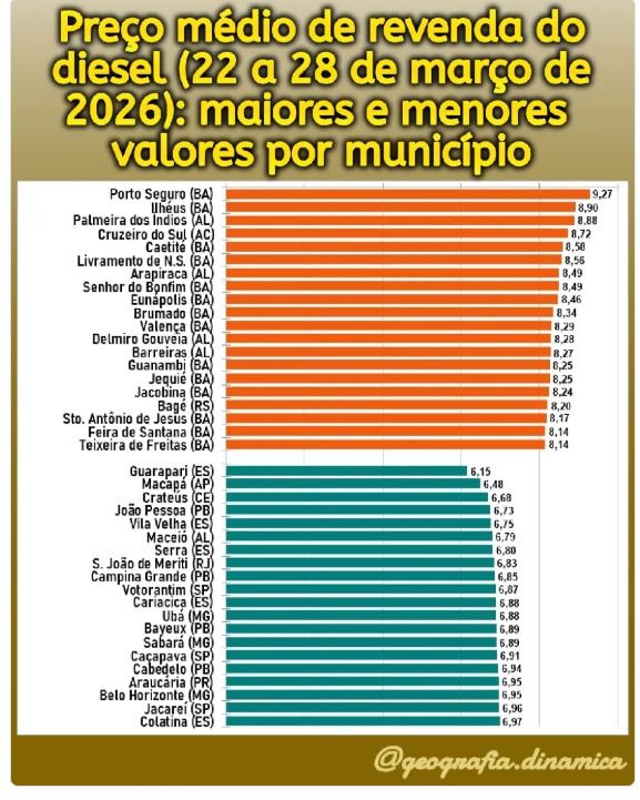 Em Cruzeiro do Sul, segunda maior cidade do Acre, o diesel é vendido a R$ 8,18, valor acima da média nacional e que evidencia as disparidades regionais no preço do combustível. O dado integra levantamento da plataforma Geografia Dinâmica, referente ao período de 22 a 28 de março de 2026.