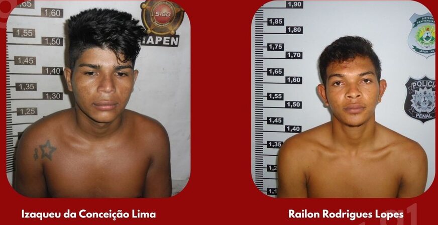 João Paulo Lima de Souza e Robson Rodrigues da Silva foram capturados nesta terça-feira (24) após fugirem da Divisão de Estabelecimento Penal Manoel Neri da Silva, em Cruzeiro do Sul, no interior do Acre, na madrugada dessa segunda (23).