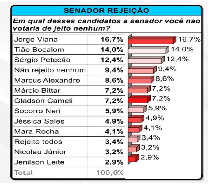 No que diz respeito a rejeição, o campeão é Jorge Viana (PT). Pelo menos 16,7% dizem que jamais votariam no ex-senador. Quem compete com ele nesse quesito é Sérgio Petecão (PSD), sobre quem 12,4% garantem não votar nunca.