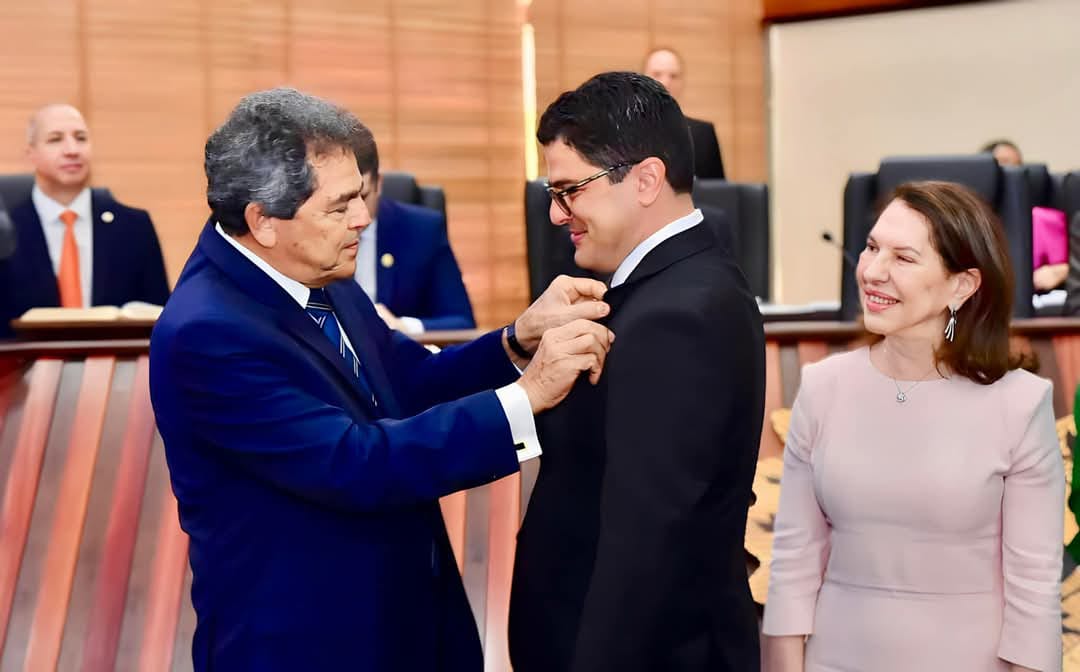 Eduardo Ribeiro recebe o broche de deputado do pai, Valmir, observado pela mãe, Dilza Ambros Ribeiro