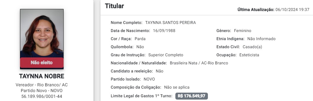Já Taynna Nobre declarou ser casada, com nível superior completo, natural de Rio Branco, ocupação esteticista. Nas receitas, segundo o DivulgCand, declarou recebimento de R$ 8.159 reais. O valor foi doação de partido, o Novo.