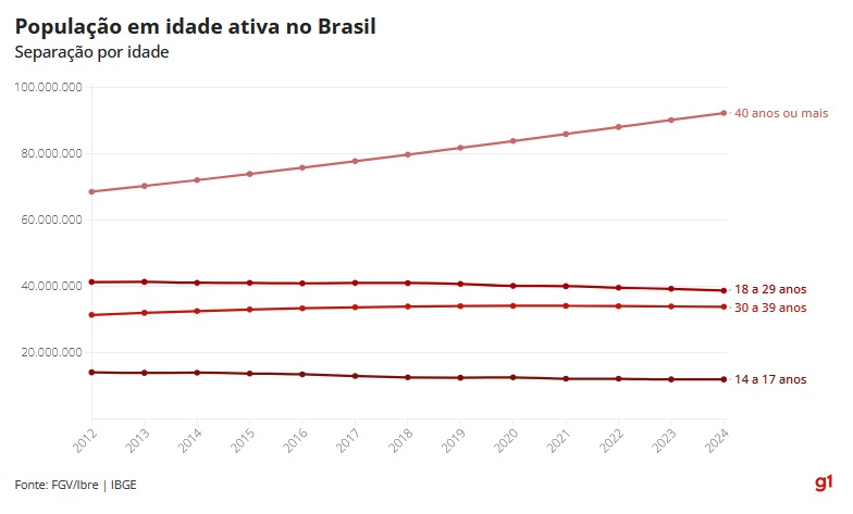 A mesma tendência aparece entre os ocupados: enquanto a participação das pessoas entre 14 e 17 anos caiu 8% entre 2024 e 2012, a dos trabalhadores com 40 anos ou mais cresceu 36%.