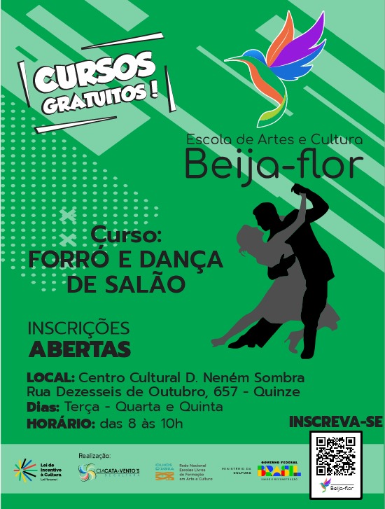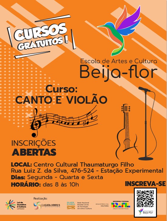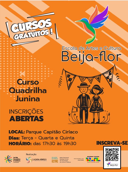A Escola de Arte e Cultura Beija-Flor, em parceria com o Ministério da Cultura (MinC) e a Fundação Municipal de Cultura Garibaldi Brasil (FGB), está com inscrições abertas para três cursos, são eles: Canto e Violão, Quadrilha Junina e Forró e Dança de Salão. Com aulas práticas e espaços culturais da capital acreana, a escola oferece uma oportunidade única para jovens e adultos que amam arte e cultura.